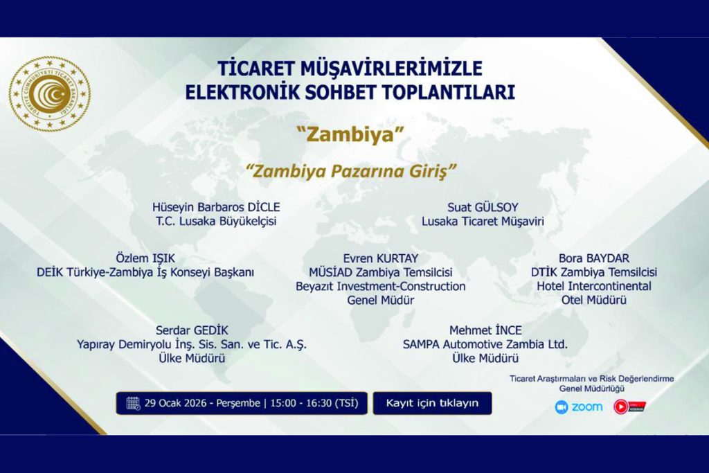 Sayın Üyemiz, – Ticaret Bakanlığı Ticaret Araştırmaları ve Risk Değerlendirme Genel Müdürlüğü’nden Alınan Yazı Metni Aşağıya Çıkartılmıştır. Ticaret Bakanlığı tarafından düzenlenmekte olan Ticaret Müşavirlerimizle Sektörel Elektronik Sohbet Toplantıları “Zambiya: Zambiya Pazarına Giriş’’ e-sohbet etkinliği 29 Ocak 2026 Perşembe günü saat 15:00-16:30 saatleri arasında gerçekleştirilecektir. Zambiya Elektronik Sohbet Toplantısı Kısa Link : https://bit.ly/3LpEvt4